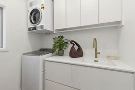 Practicality has not been forgotten either. A separate laundry with a walk in linen cupboard, electric blinds and a wine fridge adds further functionality. The fully fenced section provides ample space for the boat, outdoor toys and trampoline.